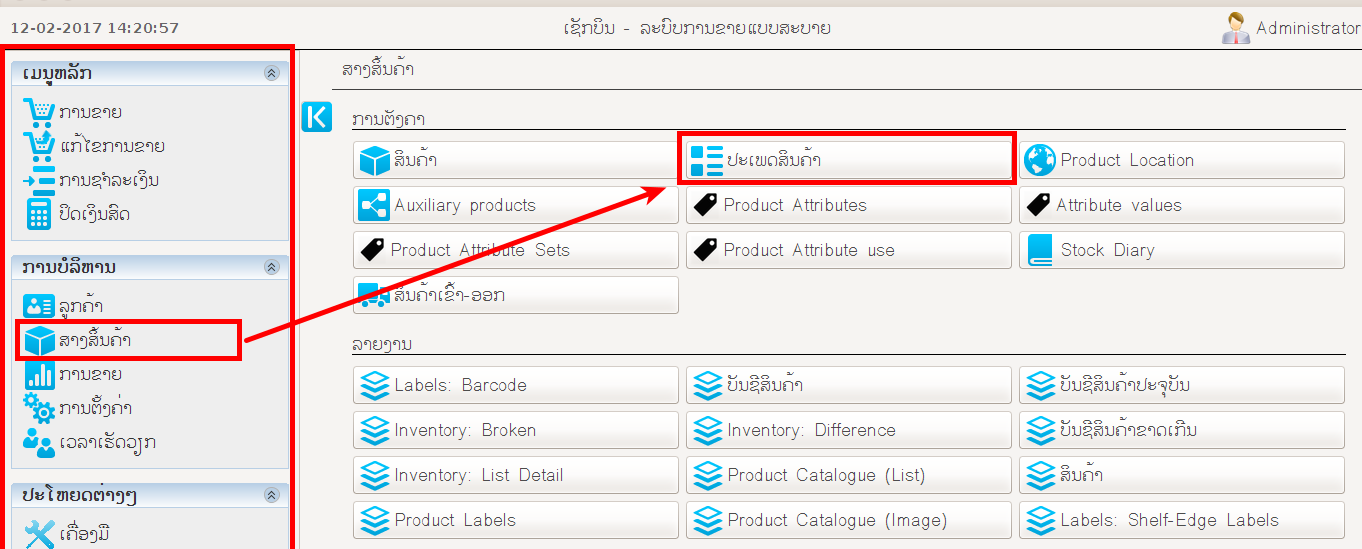 ເປີດເມນູເບຶ້ຶອງຊ້າຍແລ້ວ > ສາງສິນຄ້າ > ປະເພດສີນຄ້າ
